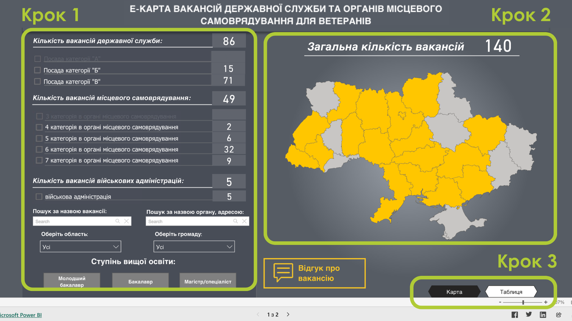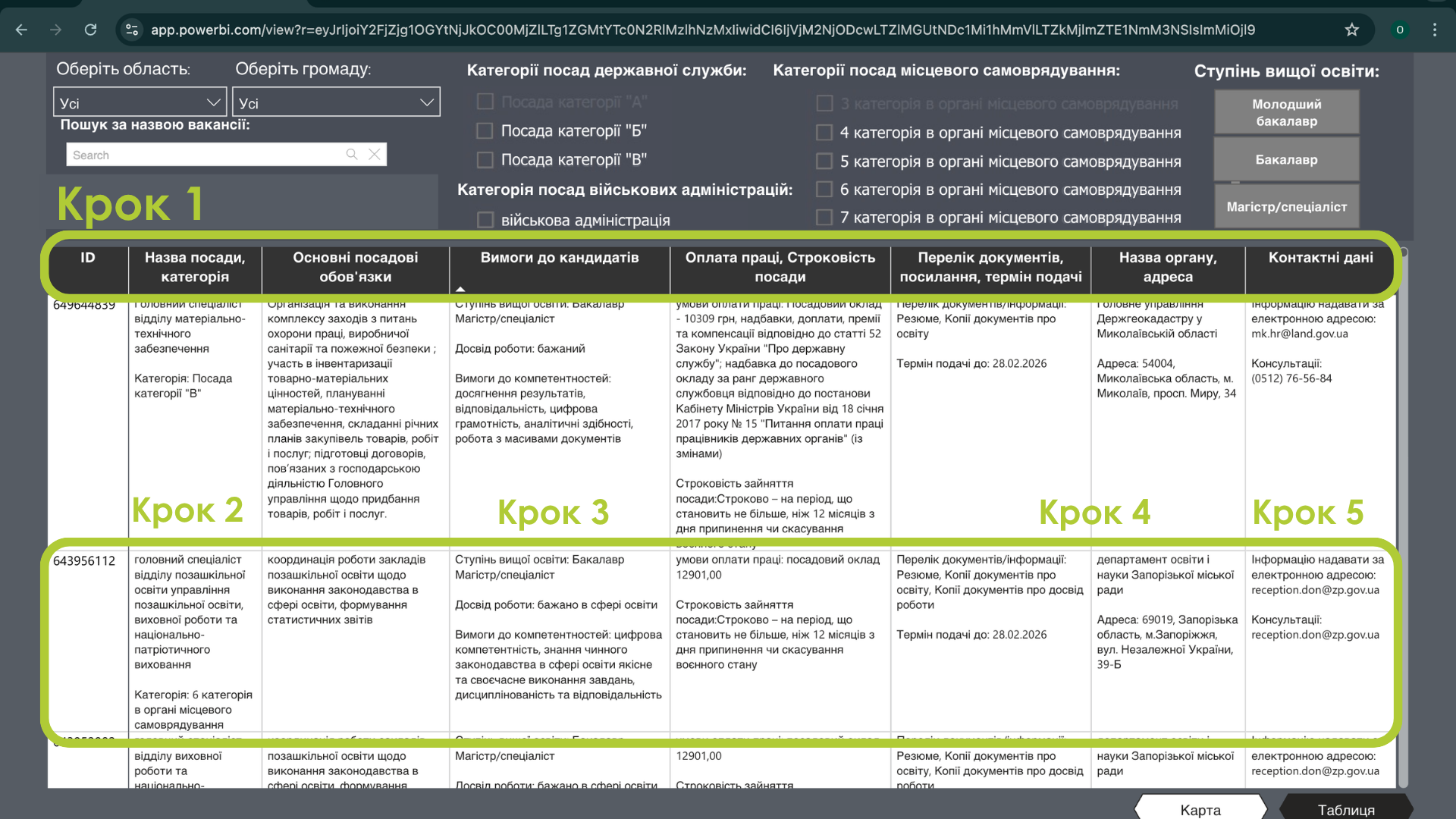 Крок 3. Карта та таблиця (праворуч знизу). Перехід з візуального розміщення вакансій на території України до детального опису вакансій.