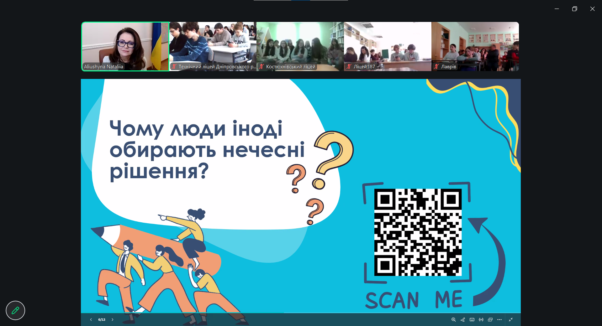 У межах уроку учасники розглянули типові ситуації, що демонструють важливість чесності, відповідальності та справедливості. Обговорювалися питання особистого вибору, впливу поведінки однієї людини на інших та значення рівних умов та однакових правил для всіх.