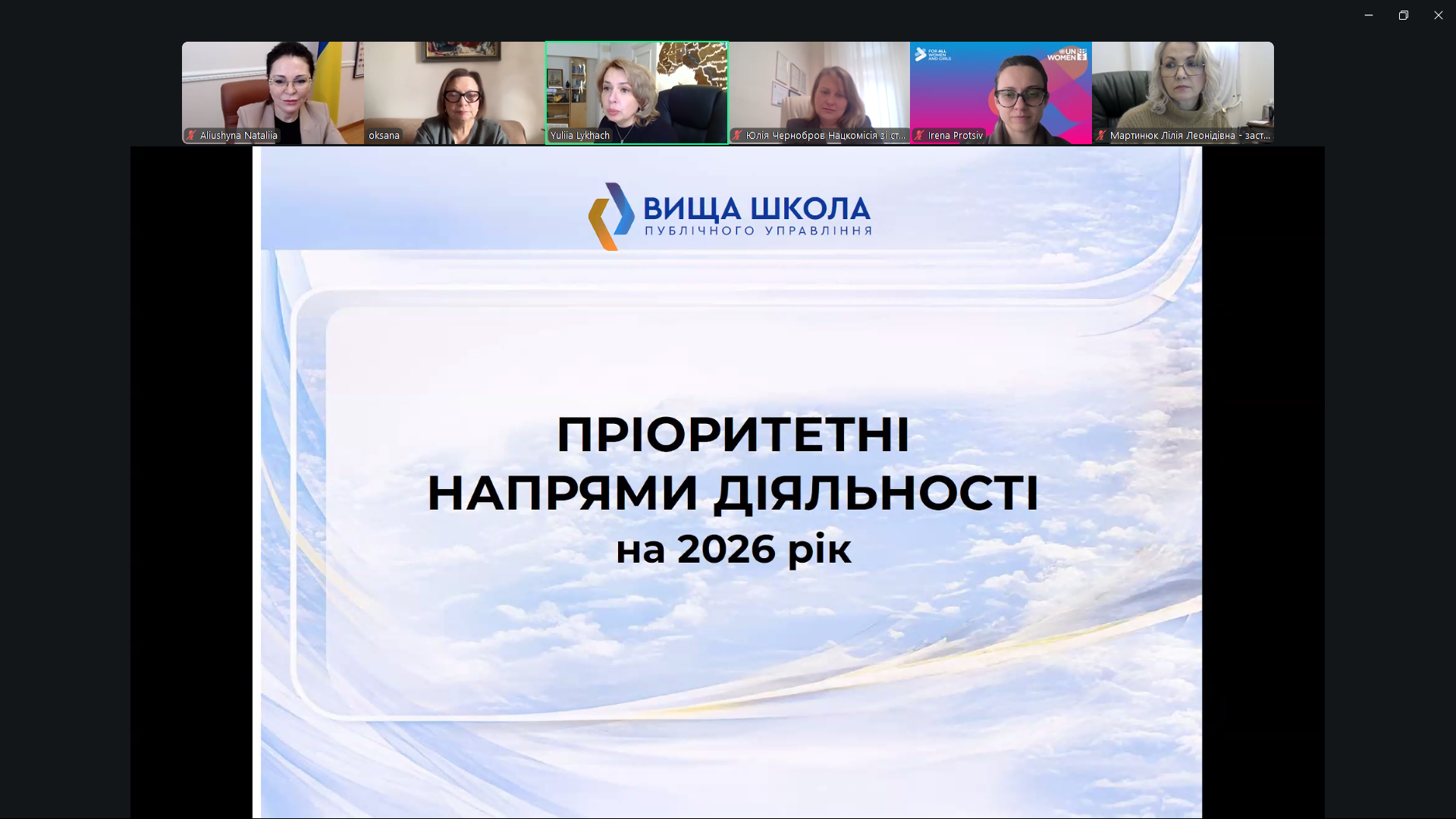У ході засідання директорка Вищої школи Юлія Лихач презентувала пріоритетні напрями діяльності установи на 2026 рік. Серед них - розвиток професійного навчання для вищого корпусу державної служби, підготовка управлінців за сім’ями посад, підтримка європейської та євроатлантичної інтеграції, мовна підготовка, розвиток цифрових компетентностей і кібербезпеки.