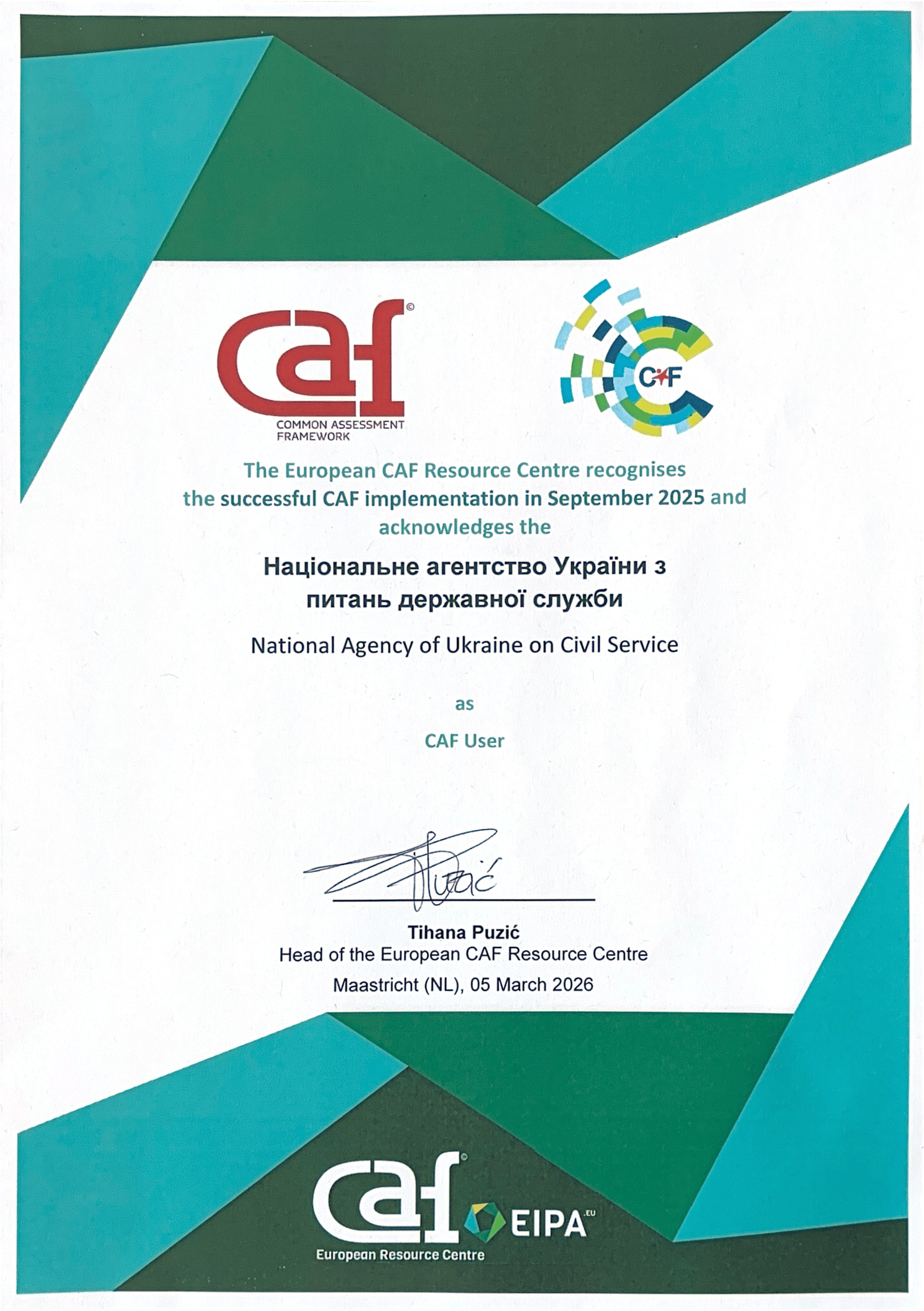 05 березня НАДС отримало міжнародну відзнаку «Користувач CAF» (CAF User) від Європейського ресурсного центру CAF, що функціонує при Європейському інституті державного управління (EIPA).