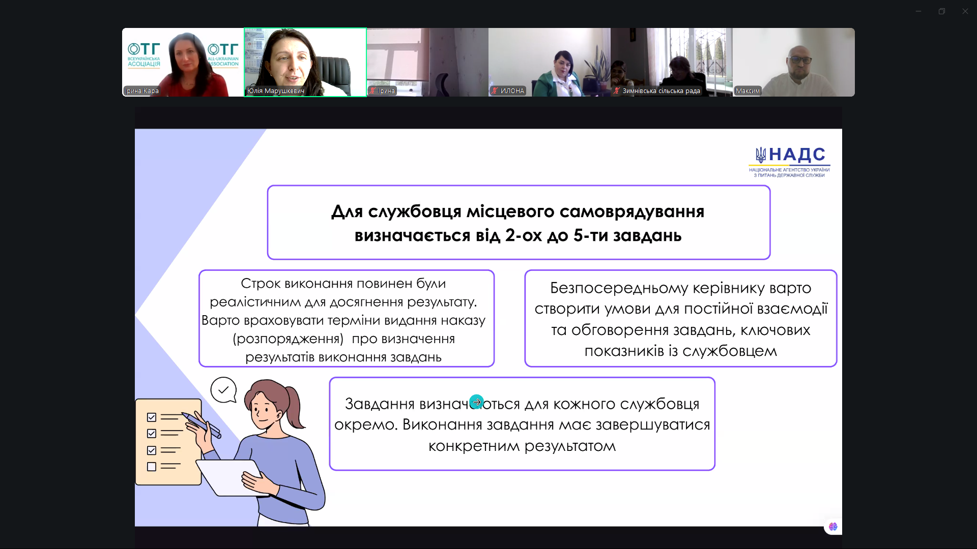 До участі у вебінарі долучилося більше 200 представників органів місцевого самоврядування, серед яких керуючі справами, секретарі місцевих рад, представники структурних підрозділів, відповідальних за управління персоналом у місцевих радах — учасників платформи “Управління людськими ресурсами“ Всеукраїнської асоціації ОТГ.
