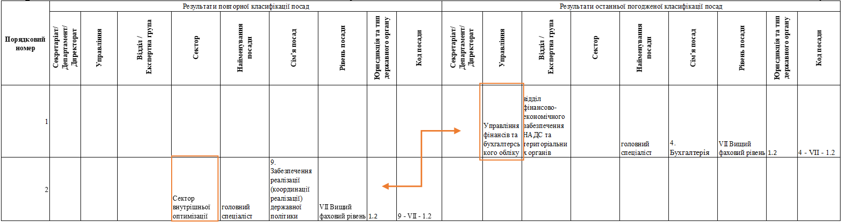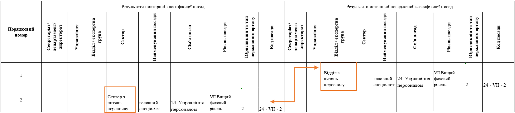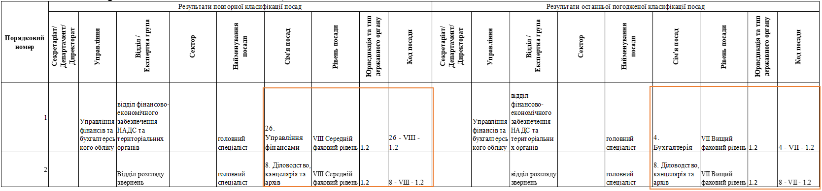 Такі зміни позначаються в одному рядку, адже це та сама посада державної служби. Заповнюється права та ліва частини порівняльної відомості.
