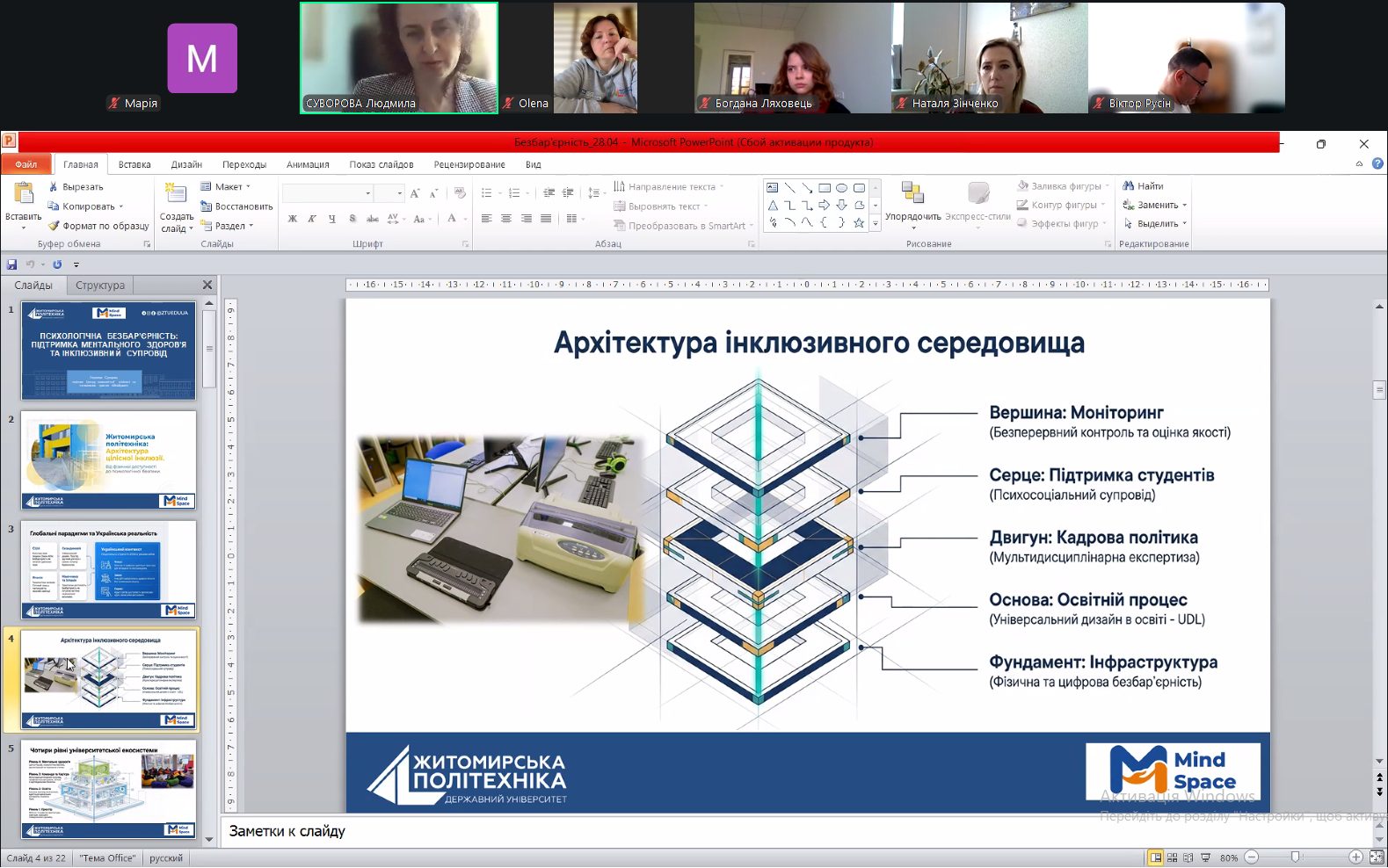 Людмила Суворова, окресливши архітектуру інклюзивного середовища, визначила 4 рівні університетської системи. Вони включають фізичну та цифрову доступність, адаптацію освітнього процесу, мультидисциплінарний супровід та кар'єрний міст, а також психологічну безпеку.