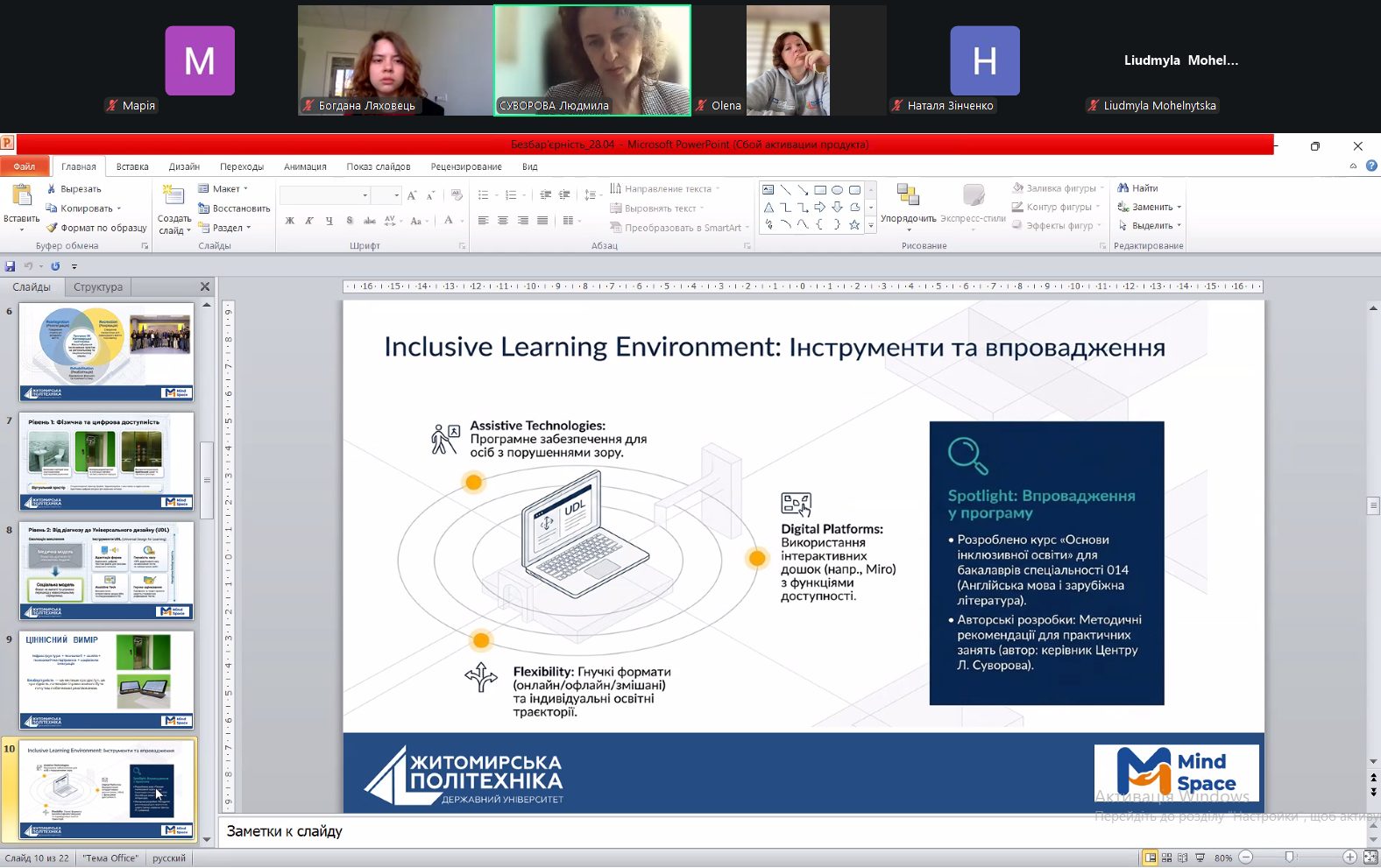 Своїм досвідом поділилася Людмила Суворова, доцент кафедри педагогічних технологій та мовної підготовки цього університету, керівник Центру психосоціальної підтримки та інклюзивних практик. Вона на прикладі «Житомирської політехніки» продемонструвала підходи до створення інклюзивного освітнього середовища та організації психосоціальної підтримки.